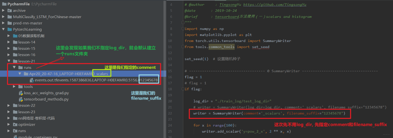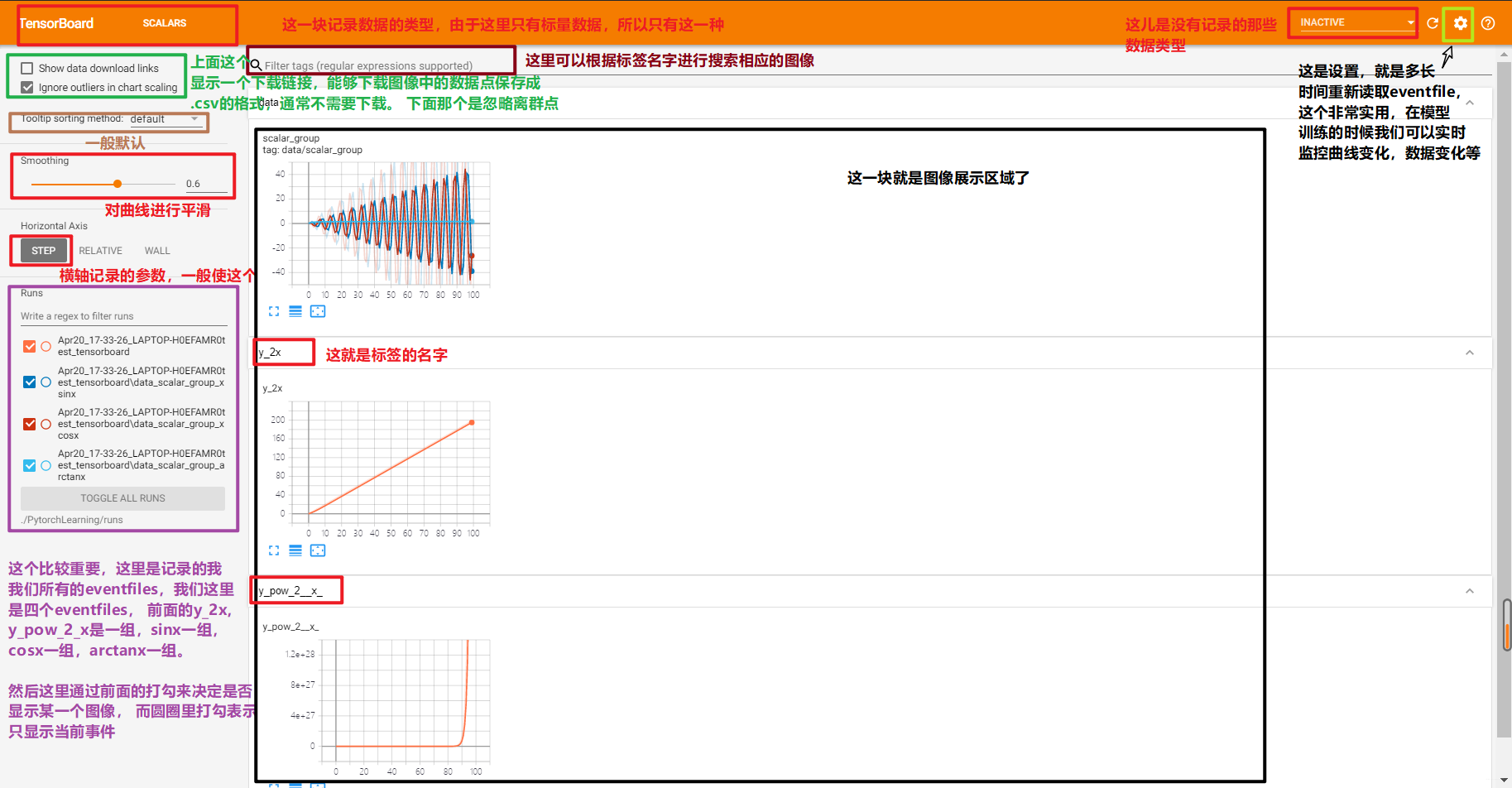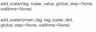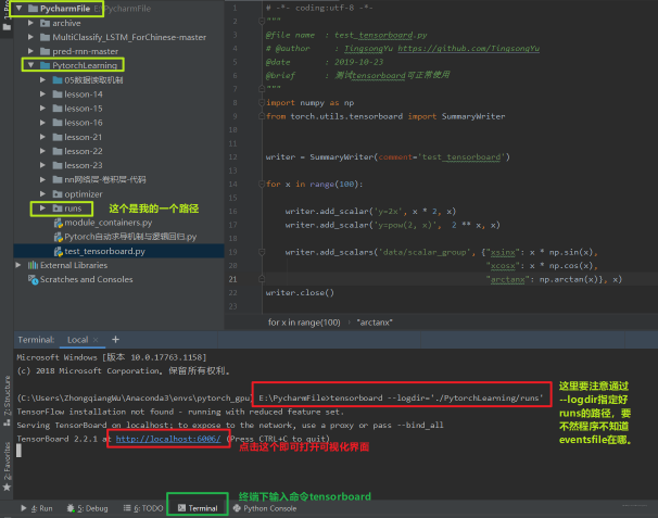 <br />上面要从 torch.utils.tensorboard 里面导入 SummaryWriter 这个类,这个类是我们最根本的类,用来创建一个 writer,这个 writer 可以记录我们想要可视化的那些数据,这里做的演示很简单,就是可视化几个函数图像。<br />我们运行代码,会发现报错,提示`ModuleNotFoundError: No module named 'tensorboard'`, 所以我们得先安装 Tensorboard, 这个`pip install tensorboard`进行安装即可,一定要安装到你运行的环境里面。然后运行,依然会报错,提示`ModuleNotFoundError: No module named 'past'`, 这个注意, 我们得`pip intall future`, 这里千万不要用 past。 这时候我们会发现当前文件夹下有个 runs:<br /><br />下面我们回到终端当中, 然后输入 tensorboard 读取这个 event files<br /><br />注意, 那个`--logdir=`后面不能加引号,上面的会提示找不到 eventsfile, 所以应该`tensorboard --logdir=./PytorchLearning/runs`, 这样我们点击下面的那个链接就可以看到我们创建的可视化事件了。 下面一个图介绍 Tensorboard 界面:<br />这就是 Tensorboard 的安装和简介的东西了。 下面我们看看这个东西到底应该如何使用了。<a name="e1bbff34"></a>## 3. Tensorboard 的基本使用Tensorbord 的基本使用包括准确率和损失的可视化,参数数据的分布及参数梯度的可视化等。 下面我们一一来学习。但是在正式学习之前,我们得先了解一些基础知识:<a name="5658f234"></a>### 3.1 SummaryWriter这个类的功能是提供创建 event file 的高级接口。<br />- log_dir: event file 输出文件夹, 如果不设置的话,就会创建一个 runs, 通常自己设置- comment:不指定 log_dir 时, 文件夹后缀- filename_suffix: event file 文件名后缀我们可以从代码里面看一下, 先看一下不用 log_dir 的效果:<br />下面我们指定 load_dir,就会发现此时 comment 就不起作用了:<br />上面就是如何创建一个 event file, 那么我们再看看一些方法:1. add_scaler()/add_scalers()<br />功能: 记录标量<br /><br />- tag 表示图像的标签名, 图的唯一标识,就是图的标题- scaler_value 表示要记录的标量,可以理解为 y 轴,- global_step 表示 x 轴。注意这个用起来的一个局限性就是它只能画一条线,但是往往模型训练的时候想监控训练集和验证集的曲线的对比情况,那时候这个不能使了。可以用 add_scalers(), 这里面两个参数:- main_tag: 该图的标签- tag_scaler_dict: key 是变量的 tag(类似于每条曲线的标签), value 是变量的值(等用于上面的 scaler_value, 只不过是可以多个线)这两个的使用我们前面的那个例子:```pythonwriter.add_scalar('y=2x', x * 2, x)writer.add_scalar('y=pow(2, x)', 2 ** x, x)writer.add_scalars('data/scalar_group', {"xsinx": x * np.sin(x),"xcosx": x * np.cos(x),"arctanx": np.arctan(x)}, x)