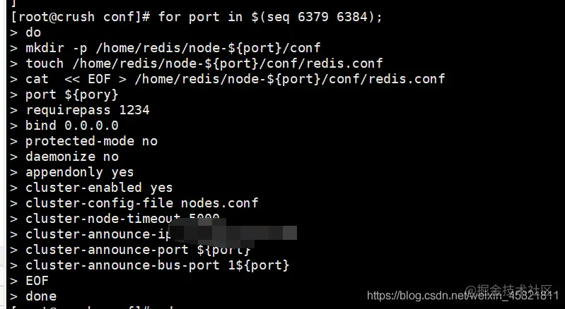 for port in $(seq 6379 6384); do mkdir -p /home/redis/node-${port}/conf touch /home/redis/node-${port}/conf/redis.conf cat << EOF > /home/redis/node-${port}/conf/redis.conf port ${port} requirepass 1234 masterauth 1234 bind 0.0.0.0 protected-mode no daemonize no appendonly yes cluster-enabled yes cluster-config-file nodes.conf cluster-node-timeout 5000 cluster-announce-ip 114.115.158.185 cluster-announce-port ${port} cluster-announce-bus-port 1${port} EOF done