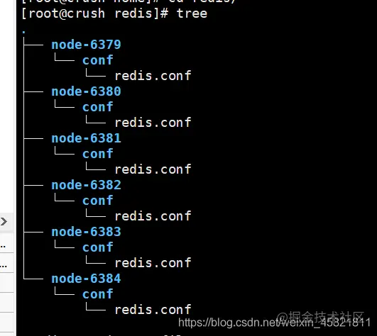 命令解释:😊- port:节点端口;- requirepass:设置密码,访问时需要验证- masterauth: 当master服务设置了密码保护时,slave服务连接master的密码。这个配置很重要,当初我没配置,然后master挂了,slave没有上位。原因就是没配置这个参数,导致slave复制master数据的时候,因为设置了密码,导致不能复制数据,上位失败。如果开启了密码验证模式,所有的主从节点必须配置masterauth,因为某一个节点宕机重启之后,会自动变为从节点,此时如果想要从master复制数据,就必须需要主节点的密码- protected-mode:保护模式,默认值 yes,即开启。开启保护模式以后,需配置 bind ip 或者设置访问密码;关闭保护模式,外部网络可以直接访问;- daemonize:是否以守护线程的方式启动(后台启动),默认 no;- appendonly:是否开启 AOF 持久化模式,默认 no;- cluster-enabled:是否开启集群模式,默认 no;- cluster-config-file:集群节点信息文件;- cluster-node-timeout:集群节点连接超时时间;节点超时时间,单位毫秒,设置一个较小的超时时间,目的是为了后面测试自动故障转移的效果,默认15000- cluster-announce-ip:集群节点 IP- 注意: 如果你想要你的redis集群可以供外网访问,这里直接填 服务器的IP 地址即可- 如若为了安全,只是在服务器内部进行访问,这里还需要做一些修改。- cluster-announce-port:集群节点映射端口;- cluster-announce-bus-port:集群节点总线端口。**redis 在官网上有说明为什么需要映射两个端口** :[redis官网](https://link.juejin.cn/?target=https%3A%2F%2Fredis.io%2Ftopics%2Fcluster-tutorial)<br />---执行命令完:<br /><br />我们通过tree 命令查看目录结构:(如果没有 tree 命令先安装 yum install -y tree)<br />---接下来就是启动容器拉<a name="etlac"></a>## 三、启动容器<a name="NiQ0U"></a>### 3.1、启动redis容器因为要启动六个容器,一个一个去启动,肯定是麻烦丫。就再次借助shell编程的力量。```shellfor port in $(seq 6379 6384); \do \docker run -it -d -p ${port}:${port} -p 1${port}:1${port} \--privileged=true -v /home/redis/node-${port}/conf/redis.conf:/usr/local/etc/redis/redis.conf \--privileged=true -v /home/redis/node-${port}/data:/data \--restart always --name redis-${port} --net myredis \--sysctl net.core.somaxconn=1024 redis redis-server /usr/local/etc/redis/redis.confdone