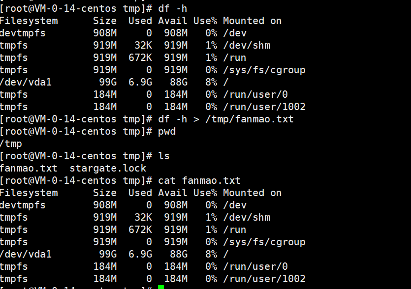 将服务器当前的系统磁盘使用情况信息 保存到文件 /tmp/fanmao.txt 文件