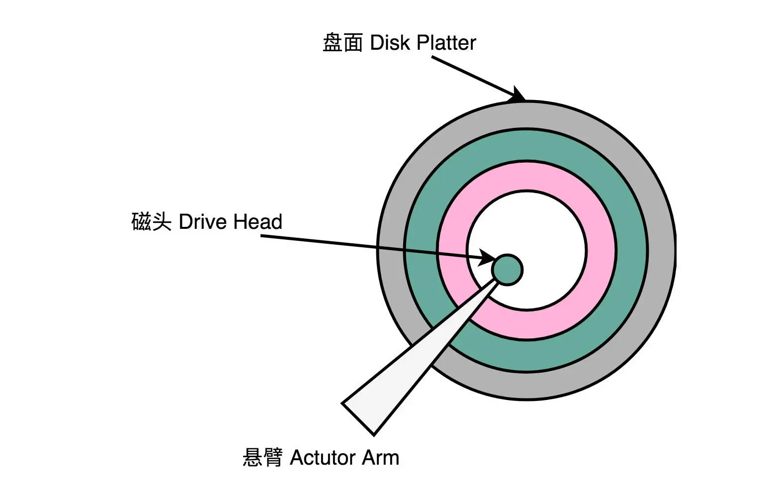 悬臂(Actutor Arm):悬臂链接在磁头上,并且在一定范围内会去把磁头定位到盘面的某个特定的磁道(Track)上。