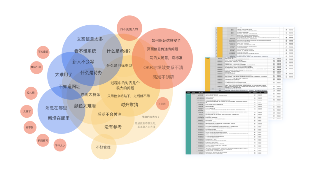 前期在公司内部针对普通员工、MGR、HRBP、高层 4 种角色,调研了 100 多位内部用户的心声,将不同岗位和职级对于绩效系统的问题真实反馈收集汇总。
