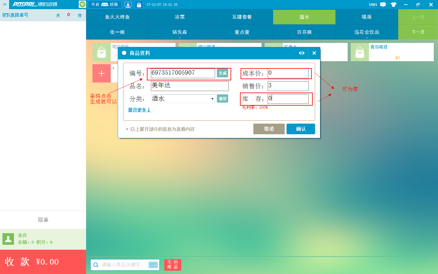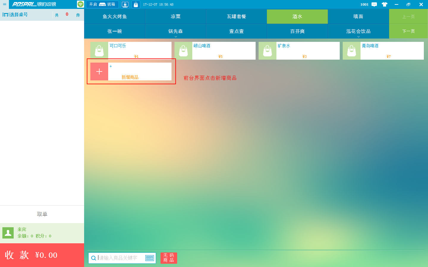 ** 前台新增商品**<br /><br />如若没有此项,去前台打开设置,通用设置里面打开,打开前台需要交接班刷新次<br /><br />