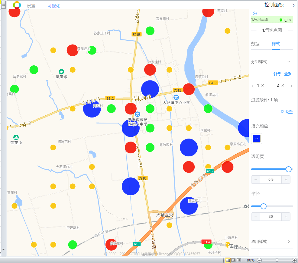 - 数值区间 1000以上:显示蓝色,气泡大小30.