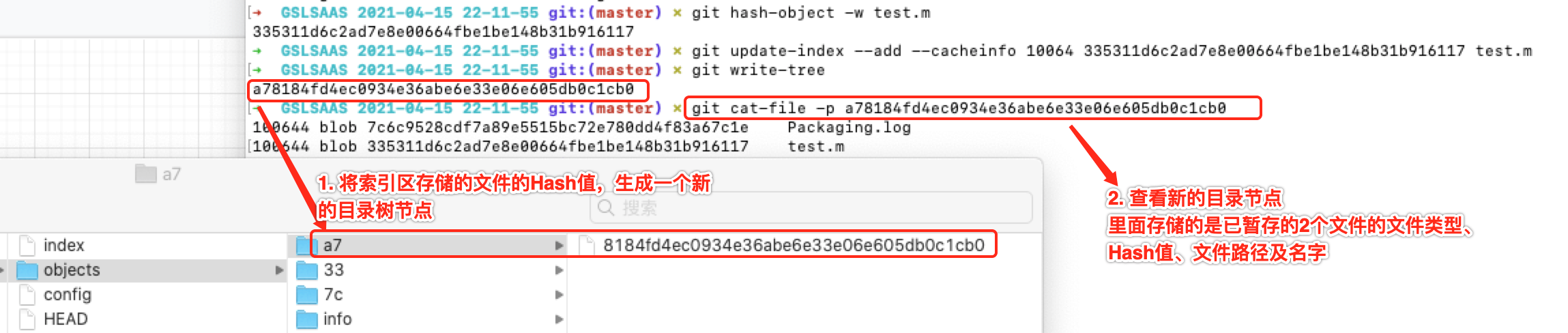 计算出当前未提交的文件内容的Hash值、及将内容转成二进制的形式存储到文件当中。这个文件就放在.git/objects 目录下。由于不同的文件系统,对目录下文件的数量有限制,且考虑提高目录检索的效率,每个文件都会单独建立一个文件夹,文件夹的名字是Hash值的前2位,文件的名字是Hash值的后38位。
