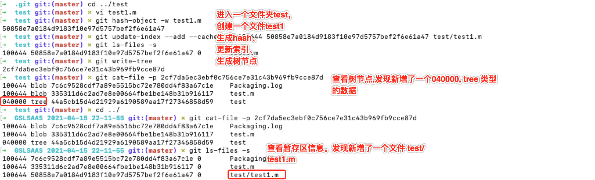 git hash-object -w test.m // 2. 把hash值更新索引区。所以索引区只保存hash值,不保存改变文件的元数据
