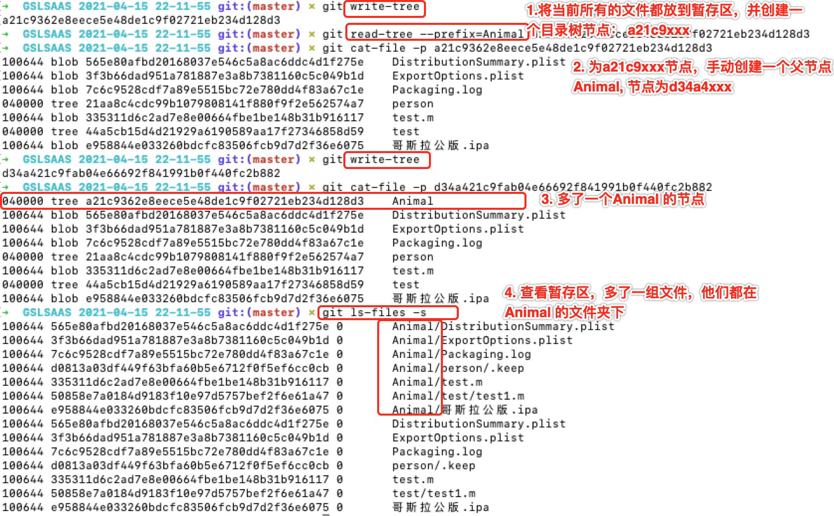 // 1.为某个节点创建一个父节点,及父目录 git read-tree —prefix=Animal a21c9362e8eece5e48de1c9f02721eb234d128d3 // 2.将新的目录写入目录树,并创建节点 git write-tree
