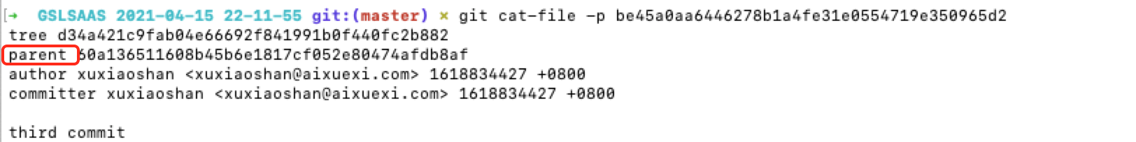 // 提交暂存区生成的目录树的节点,会生成一个提交对象 echo ‘init git’ | git commit-tree d34a421c9fab04e66692f841991b0f440fc2b882 // 提交暂存区生成的目录树的节点,会生成一个提交对象,并且指定他的父节点 echo ‘third commit’ | git commit-tree d34a421c9fab04e66692f841991b0f440fc2b882 -p 60a136511608b45b6e1817cf052e80474afdb8af