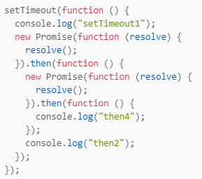 setTimeout(function () {console.log("setTimeout1");new Promise(function (resolve) {resolve();}).then(function () {new Promise(function (resolve) {resolve();}).then(function () {console.log("then4");});console.log("then2");});});new Promise(function (resolve) {console.log("promise1");resolve();}).then(function () {console.log("then1");});setTimeout(function () {console.log("setTimeout2");});console.log(2);queueMicrotask(() => {console.log("queueMicrotask1")});new Promise(function (resolve) {resolve();}).then(function () {console.log("then3");});