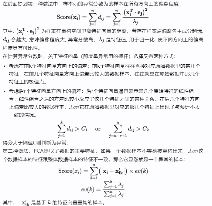<a name="cZyYv"></a># <br /><br />_**6**_<br />_**『基于降维的方法』**_<a name="cbasz"></a>### **1. Principal Component Analysis (PCA)****资料来源:**<br />[11] 机器学习-异常检测算法(三):Principal Component Analysis - 刘腾飞,知乎:https://zhuanlan.zhihu.com/p/29091645<br />[12] Anomaly Detection异常检测--PCA算法的实现 - CC思SS,知乎:https://zhuanlan.zhihu.com/p/48110105<br />PCA在异常检测方面的做法,大体有两种思路:<br />(1) 将数据映射到低维特征空间,然后在特征空间不同维度上查看每个数据点跟其它数据的偏差;<br />(2) 将数据映射到低维特征空间,然后由低维特征空间重新映射回原空间,尝试用低维特征重构原始数据,看重构误差的大小。<br />PCA在做特征值分解,会得到:- 特征向量:反应了原始数据方差变化程度的不同方向;- 特征值:数据在对应方向上的方差大小。所以,最大特征值对应的特征向量为数据方差最大的方向,最小特征值对应的特征向量为数据方差最小的方向。原始数据在不同方向上的方差变化反应了其内在特点。如果单个数据样本跟整体数据样本表现出的特点不太一致,比如在某些方向上跟其它数据样本偏离较大,可能就表示该数据样本是一个异常点。<br />在前面提到第一种做法中,样本的异常分数为该样本在所有方向上的偏离程度:<br /><br />其中, 为样本在重构空间里离特征向量的距离。若存在样本点偏离各主成分越远, 会越大, 意味偏移程度大, 异常分数高。 是特征值, 用于归一化, 使不同方向上的偏离程度具有可比性。<br />在计算异常分数时,关于特征向量(即度量异常用的标杆)选择又有两种方式:- 考虑在前k个特征向量方向上的偏差:前k个特征向量往往直接对应原始数据里的某几个特征,在前几个特征向量方向上偏差比较大的数据样本,往往就是在原始数据中那几个特征上的极值点。- 考虑后r个特征向量方向上的偏差:后r个特征向量通常表示某几个原始特征的线性组合,线性组合之后的方差比较小反应了这几个特征之间的某种关系。在后几个特征方向上偏差比较大的数据样本,表示它在原始数据里对应的那几个特征上出现了与预计不太一致的情况。得分大于阈值C则判断为异常。<br />第二种做法,PCA提取了数据的主要特征,如果一个数据样本不容易被重构出来,表示这个数据样本的特征跟整体数据样本的特征不一致,那么它显然就是一个异常的样本:其中, 是基于 维特征向量重构的样本。<br />基于低维特征进行数据样本的重构时,舍弃了较小的特征值对应的特征向量方向上的信息。换一句话说,重构误差其实主要来自较小的特征值对应的特征向量方向上的信息。基于这个直观的理解,PCA在异常检测上的两种不同思路都会特别关注较小的特征值对应的特征向量。所以,我们说PCA在做异常检测时候的两种思路本质上是相似的,当然第一种方法还可以关注较大特征值对应的特征向量。