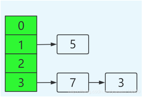 2:初始时数组长度2,key = 3, 7, 5 初始在表table[1]节点;