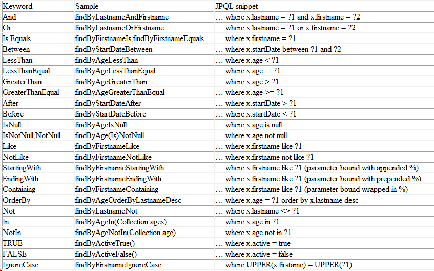 <a name="tcaSO"></a>### JpaRepository<a name="6MQFP"></a>### 复杂查询@Query<a name="71eva"></a>### 根据方法名进行查询<br /><br /><a name="83S2n"></a>### ManyToMany表结构```java@ManyToMany@ApiModelProperty(value = "用户角色")@JoinTable(name = "sys_users_roles", //name, 中间表的表名称//joinColumns 当前对象在中间表中的外键joinColumns = {@JoinColumn(name = "user_id",referencedColumnName = "user_id")},//inverseJoinColumns,对方对象在中间表中的外键inverseJoinColumns = {@JoinColumn(name = "role_id",referencedColumnName = "role_id")})private Set<Role> roles;