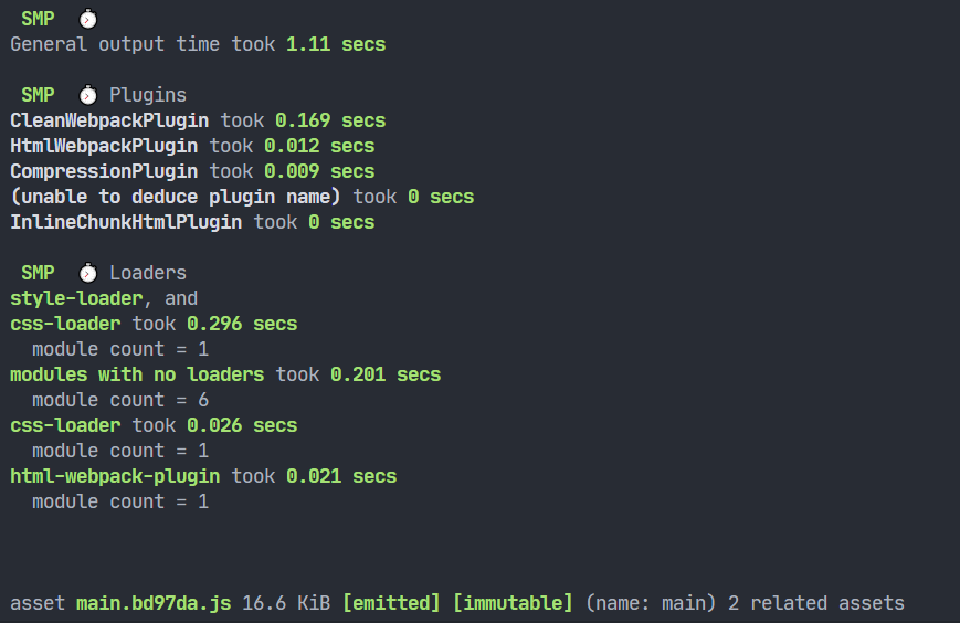 如果希望看到每个 Loder 、每个 Plugin 消耗的打包时间,可以借助一个插件:speed-measure-webpack-plugin。