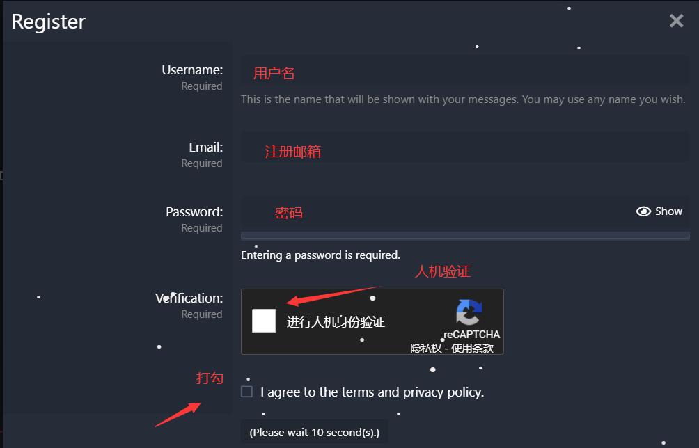 1。如图填写注册资料,请仔细一点用户名不要用中文或者奇怪字符,(倒计时10秒后会出现注册按钮)