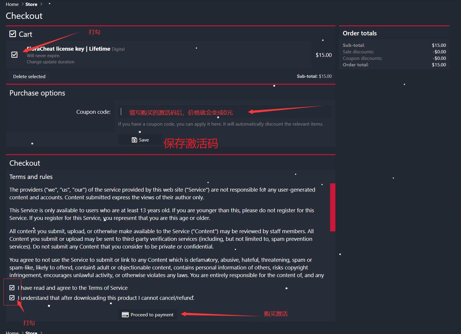 5.进入支付界面,如图打勾,输入激活码后点击Save后,价格就会变成0元,最后点购买激活。