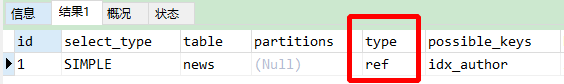 `CREATE index idx_author on news(author);``EXPLAIN select from news where author=’秦蓝’;<br /><br /> | | range | 只检索给定范围的行,使用一个索引来选择行。Key列显示使用了哪个索引。一般就是在where语句中出现了between、<>、in等的查询。<br />这种范围扫描索引会比全表扫描(索引)好,因为它只需要开始于索引的某个点,而结束于某个点,不用扫描全部索引。<br />EXPLAIN select * from users u where userid in(1,2,3);`