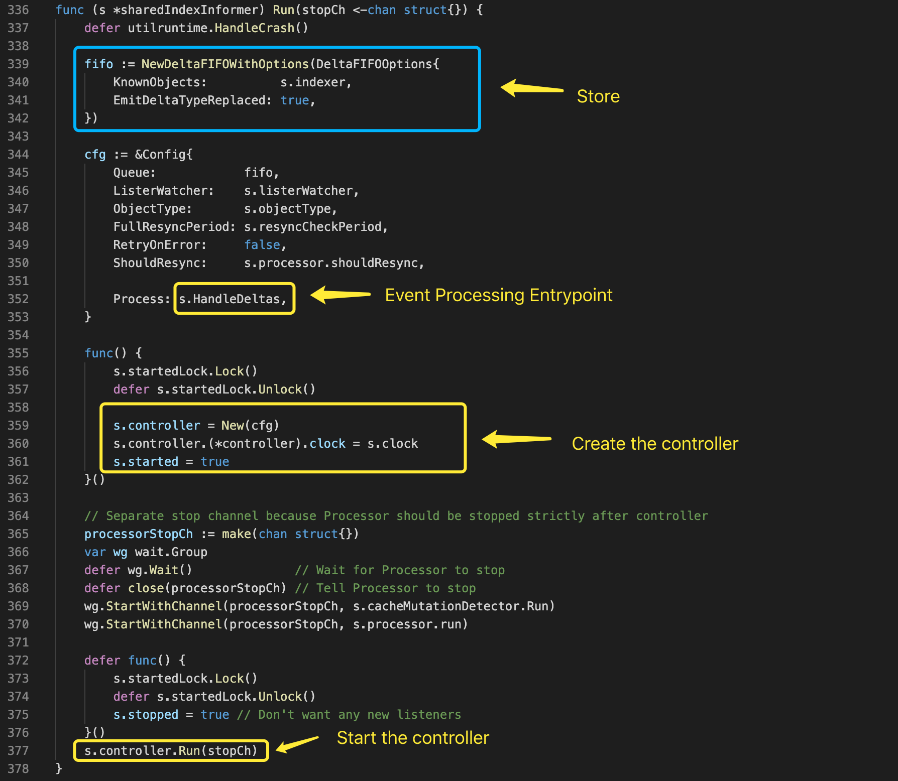 从接口间关系可以看出,SharedInformer 是核心组件,它通过 Controller 执行操作,并将结果存入 Store 中。SharedIndexInformer 为 SharedInformer 添加了 Index 功能。