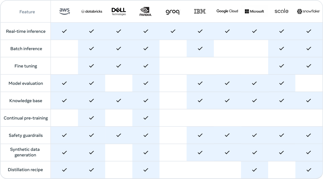 这一系列因素,最终造就了今天的 Llama 3 系列。 当然,对于普通开发者来说,如何利用 405B 规模的模型是一项挑战,需要大量的计算资源和专业知识。 发布之后,Llama 3.1 的生态系统已准备就绪,超过 25 个合作伙伴提供了可与最新模型搭配使用的服务,包括亚马逊云科技、NVIDIA、Databricks、Groq、Dell、Azure、Google Cloud 和 Snowflake 等。