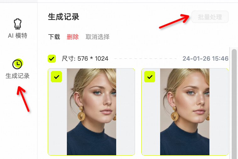 第六步: 批量下载或删除:找到【生成记录】-【批量处理】