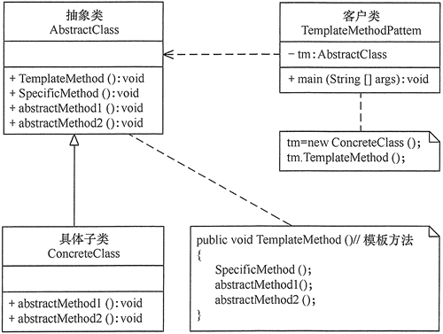 模板方法模式需要注意抽象类与具体子类之间的协作。它用到了虚函数的多态性技术以及“不用调用我,让我来调用你”的反向控制技术。现在来介绍它们的基本结构。