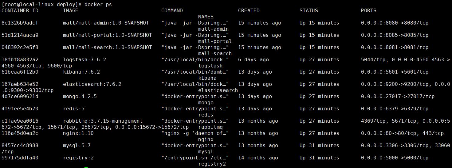 将该文件上传到linux自建的目录/mydata/deploy ,执行docker-compose up命令即可启动mall所有的应用。
