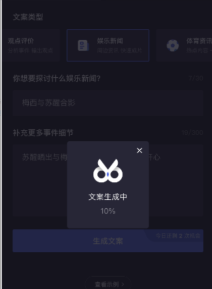 5、点击生成文案(注意!!!这里文案生成中的时候别点×,不然就浪费一次机会,一天只有三次机会,发三个视频也足够了,每天坚持早中晚各一条)