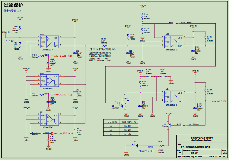 使用电压比较器 LMV331SE 实现 10A 过流保护电路,电流采样电路中 Vi 经过隔离运放和普通运放后变成 Vcurrent_adc 输入到下图比较器的 IN-,当 IN-的电压超过 IN+ 时,比较器的 OUT将输出低电平到74HC1G66GW(模拟开关)的 Y 端口和左下端的 NPN 型 MOS 管中。当 OUT 将输出低电平时,NPN-MOS 截止,此时 3V3 电压会供给 74HC1G66GW,让其使能,这样模拟开关就会闭合,74HC1G66GW 的 Y 端口与 Z 端口相当于连接在一起,低电平信号从 Z 端口,输出到下一级锁存器 SN74LVC1G373DBVR,锁存器对输入信号进行锁存并输出到与门。