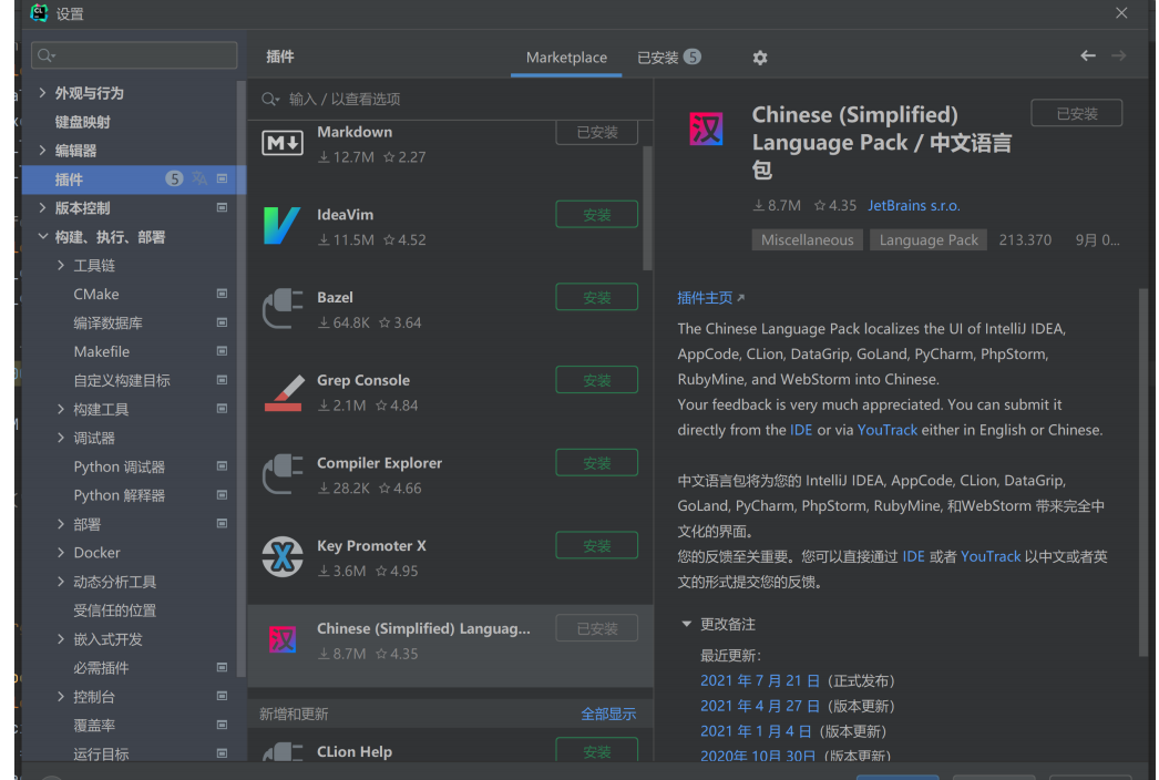 - 点击 插件,安装Chinese (Simplified) Language Pack / 中文语言包