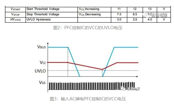 在上述条件下,输入电压瞬态的降到较低值或0V,由于输出满载,PFC输出大电容的电压VBUS迅速降低到非常低的值,PFC控制IC的VCC的电容大,VCC的电流小,因此,VCC的掉电速度远远小于VBUS的掉电速度,VCC的掉电速度慢,只要VCC高于PFC控制IC的VCC的UVLO,那么PFC控制IC仍然在工作。