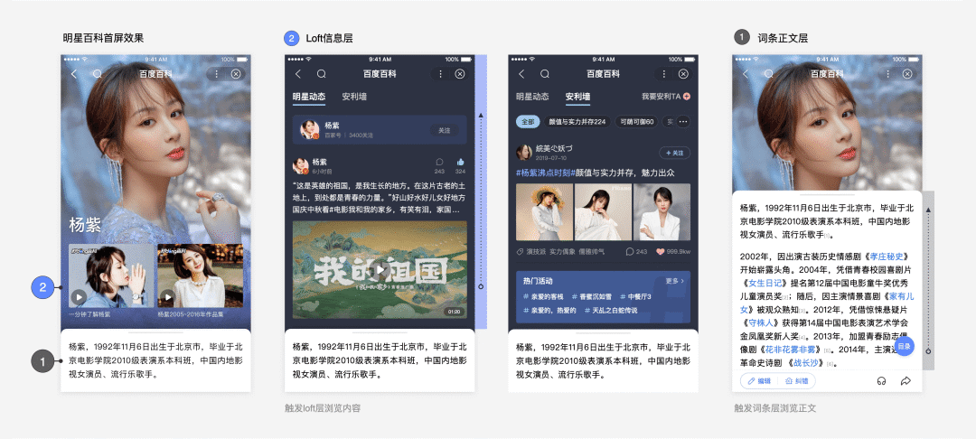 《明星百科》是百度百科的重点垂类,用户的浏览量一直很高,也受到众多粉丝用户的关注。随着 5G 时代的到来,竞品富媒体形态的发展,使产品体验突显单一,不能满足用户多元化的消费需求。为提升产品体验、丰富内容形式,增加与用户的互动性,产品层决定升级明星垂类定位,从 UGC 维护内容升级为 “粉丝共建的明星百科”,打造粉丝用户与明星的互动空间,增强用户粘度和特色内容建设,提升内容富媒体化的转变,同时通过设计创新为产品带来更多的收益空间。
