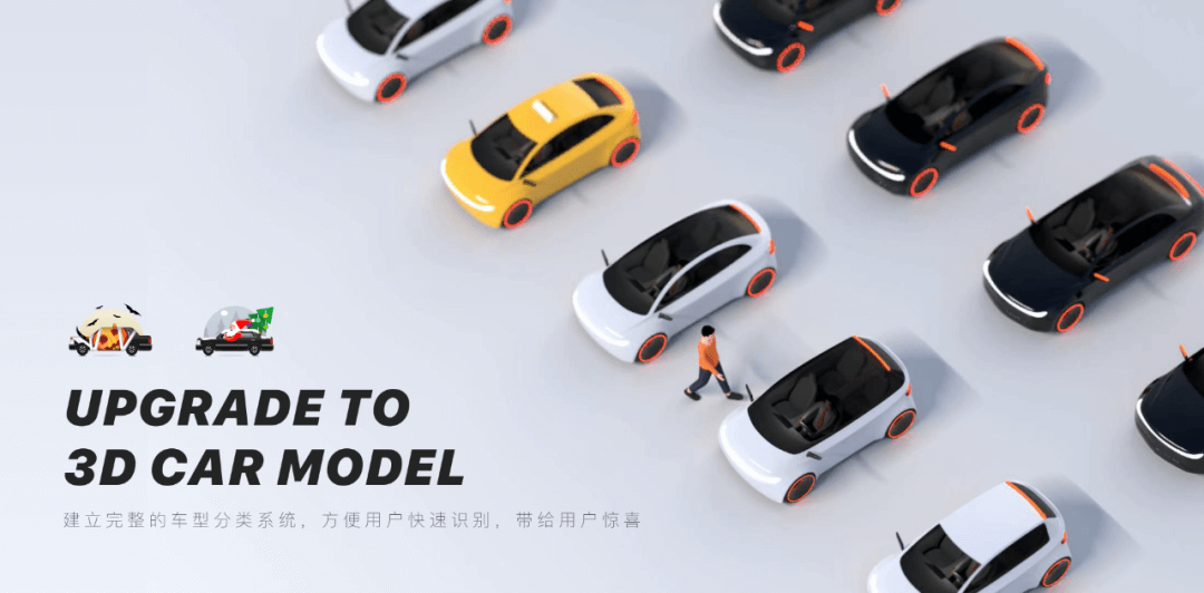 旧版地图采用了平面化的小车设计,且未区分颜色,不够直观。新版升级了全新 3D 小车,颜色与真实车辆匹配,方便用户快速识别的同时,带给用户惊喜。在节假日,对小车进行定制化设计,传递欢乐的节日氛围,提升品牌好感度。
