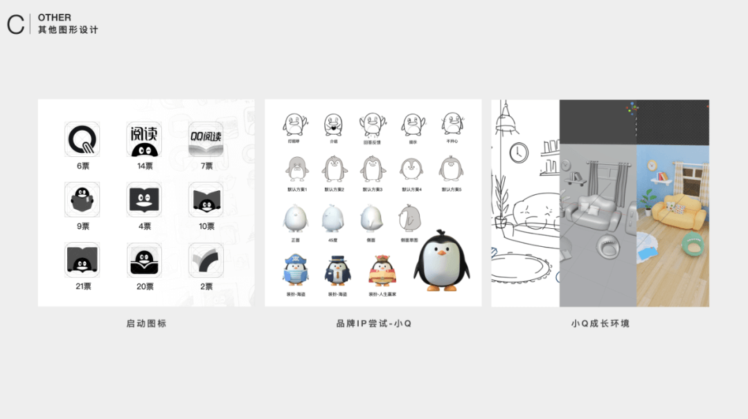 除了图标设计,我们也正在进行的品牌相关图形的设计尝试,包括 QQ 阅读应用图标 / 品牌 IP 形象及其成长环境。产品 IP 形象,可以更具亲和力的与用户沟通、传达品牌理念,促进品牌深度传播,所以这也是设计团队重点发力的部分,关于品牌 IP 的探索仍在继续,如何将品牌、产品界面以及交互体验更好地结合在一起,一直是设计师研究的课题。