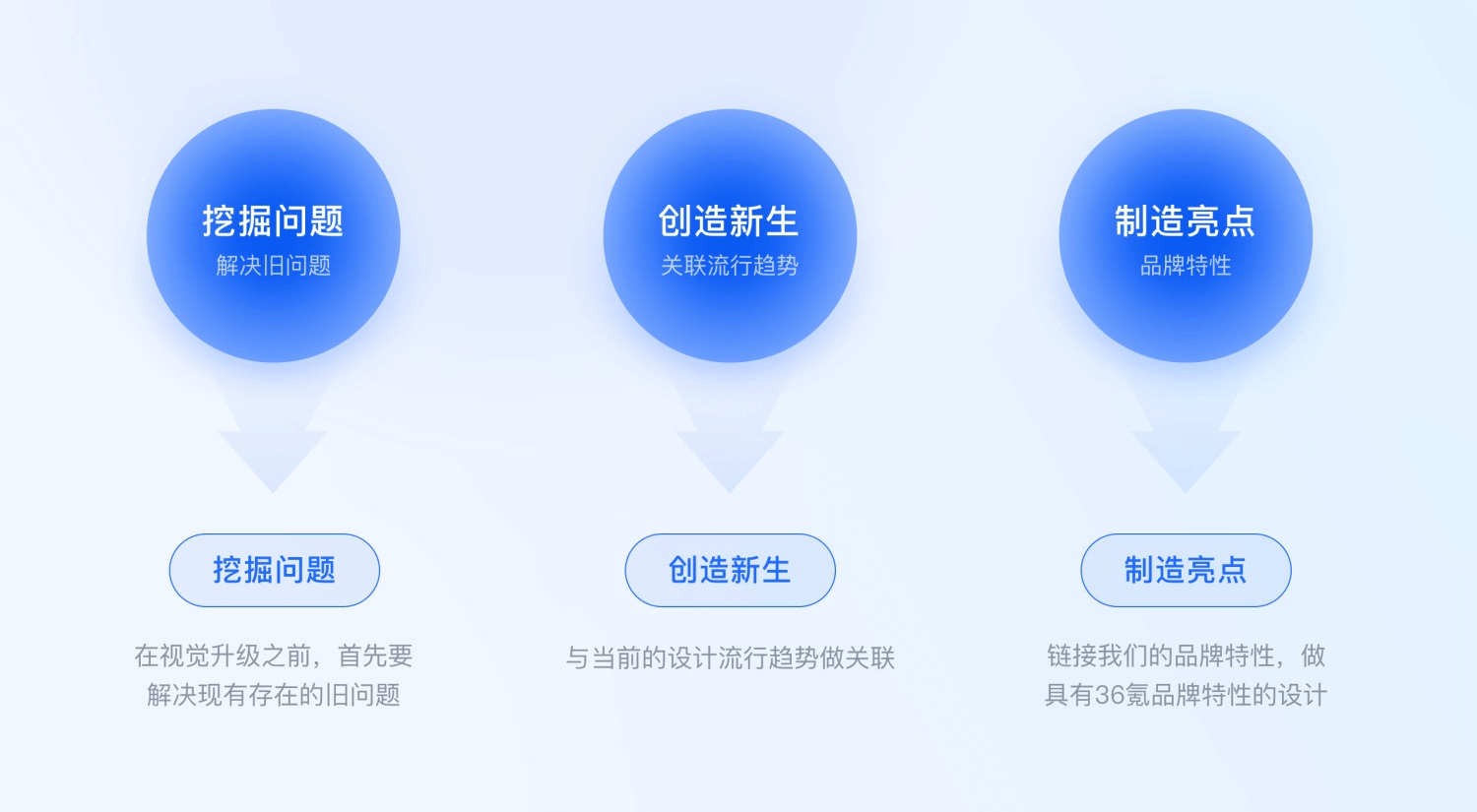 通过大量收集和整理国内外最新设计案例、流行趋势的分析文章和报告,制定出符合 36 氪的风格特征,且与当前的设计流行趋势做关联,比如有品质感的毛玻璃设计方式,更加精细化的细节处理方法。