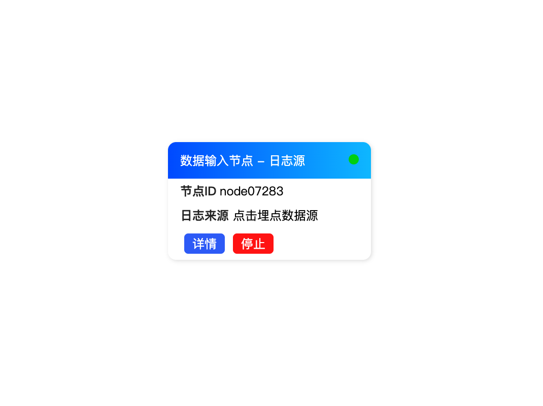 const Button = ({ color = '#2D5AF6', children, onClick }) => (<RectonClick={onClick}style={{padding: [4, 8],fill: color,margin: [0, 4],radius: 4,cursor: 'pointer',}}><Text style={{ fill: '#fff', cursor: 'pointer' }} onClick={onClick}>{children}</Text></Rect>);const Card = ({ cfg }) => {return (<Group><Rectstyle={{radius: [8],fill: '#fff',shadowColor: '#ddd',shadowBlur: 8,shadowOffsetX: 2,shadowOffsetY: 2,}}keyshapedraggable><Rectstyle={{minWidth: 200,fill: 'l(0) 0:#0049FF 1:#0EB7FF',radius: [8, 8, 0, 0],padding: 12,flexDirection: 'row',cursor: 'pointer',alignContent: 'center',}}><Text style={{ fill: '#fff' }}>数据输入节点 - 日志源</Text><Group style={{ flex: 1 }} /><Circlestyle={{r: 5,fill: '#00CF10',}}/></Rect><Group style={{ flexDirection: 'row', margin: [6, 12] }}><Text style={{ fill: '#222', fontWeight: 'bold' }}>节点ID</Text><Text style={{ fill: '#000', margin: [0, 4] }}>{cfg?.id}</Text></Group><Group style={{ flexDirection: 'row', margin: [6, 12] }}><Text style={{ fill: '#222', fontWeight: 'bold' }}>日志来源</Text><Text style={{ fill: '#000', margin: [0, 4] }}>点击埋点数据源</Text></Group><Group style={{ flexDirection: 'row', margin: [6, 12] }}><Button>详情</Button><Button color="#FF1313">停止</Button></Group></Rect></Group>);};