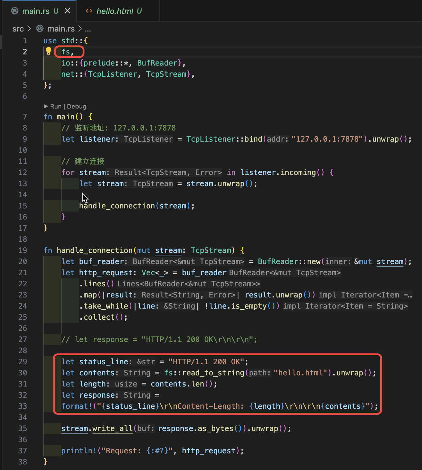 let status_line = "HTTP/1.1 200 OK";let contents = fs::read_to_string("hello.html").unwrap();let length = contents.len();let response =format!("{status_line}\r\nContent-Length: {length}\r\n\r\n{contents}");