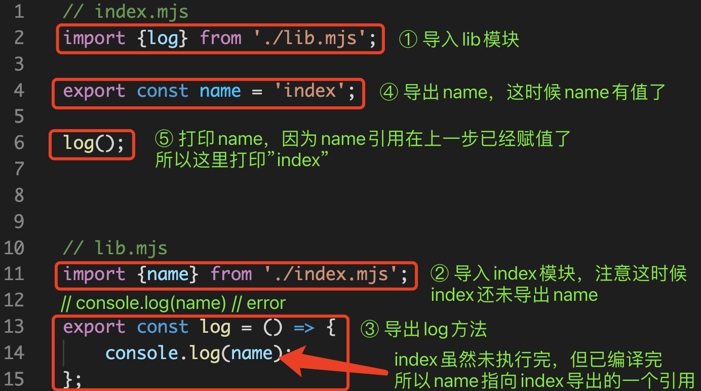 // index.mjsimport {log} from './lib.mjs';export const name = 'index';log();// lib.mjsimport {name} from './index.mjs';export const log = () => {console.log(name);};