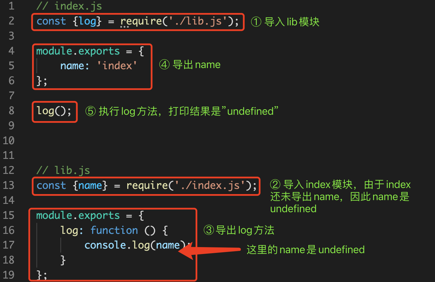 // index.jsconst {log} = require('./lib.js');module.exports = {name: 'index'};log();// lib.jsconst {name} = require('./index.js');module.exports = {log: function () {console.log(name);}};