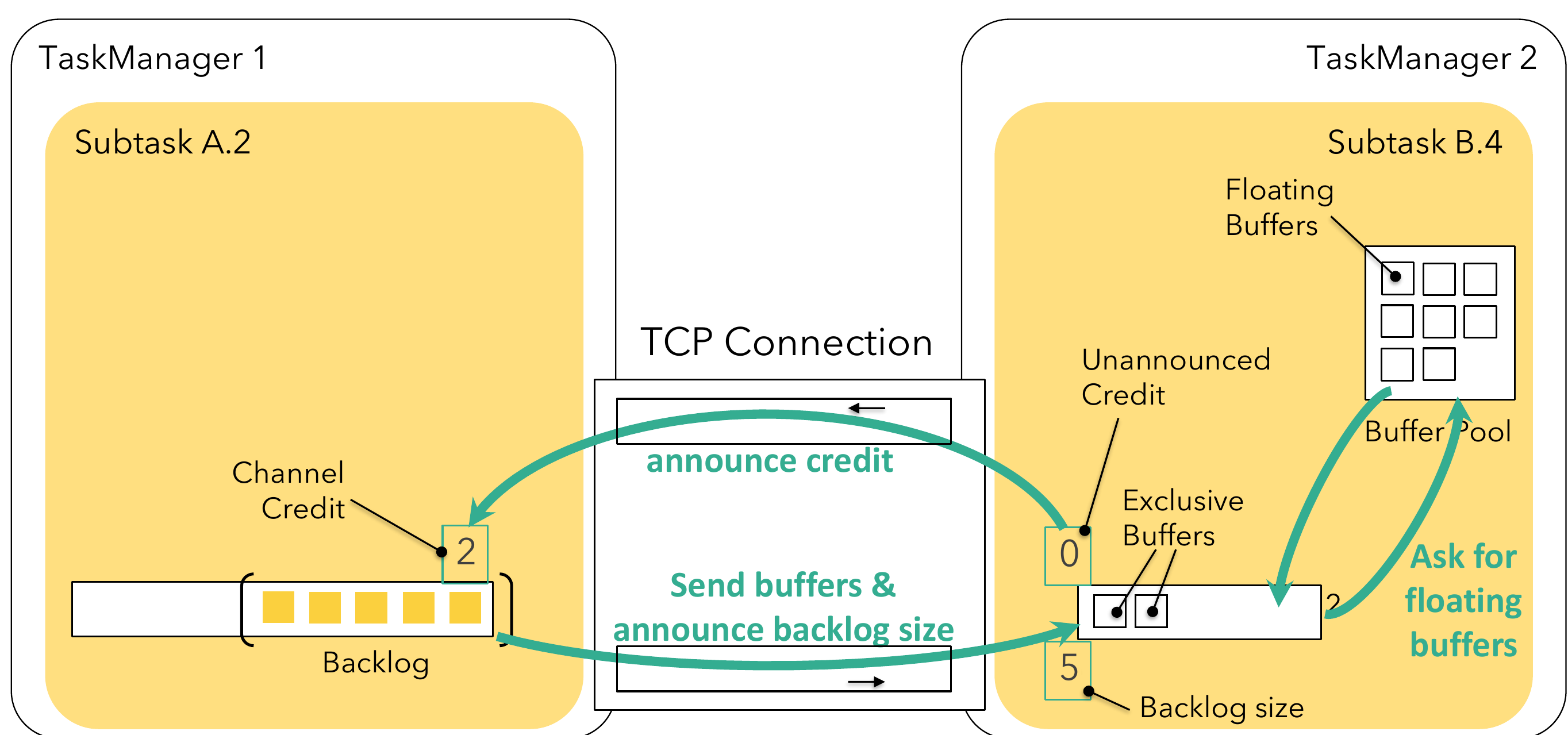 Credit-based 流量控制可确保发送端已经发送的任何数据,接收端都具有足够的能力(Buffer)来接收。新的流量控制机制基于网络缓冲区的可用性,作为 Flink 之前机制的自然延伸。每个远程输入通道(RemoteInputChannel)现在都有自己的一组独占缓冲区(Exclusive buffer),而不是只有一个共享的本地缓冲池(LocalBufferPool)。与之前不同,本地缓冲池中的缓冲区称为流动缓冲区(Floating buffer),因为它们会在输出通道间流动并且可用于每个输入通道。 数据接收方会将自身的可用 Buffer 作为 Credit 告知数据发送方(1 buffer = 1 credit)。每个 Subpartition 会跟踪下游接收端的 Credit(也就是可用于接收数据的 Buffer 数目)。只有在相应的通道(Channel)有 Credit 的时候 Flink 才会向更底层的网络协议栈发送数据(以 Buffer 为粒度),并且每发送一个 Buffer 的数据,相应的通道上的 Credit 会减 1。除了发送数据本身外,数据发送端还会发送相应 Subpartition 中有多少正在排队发送的 Buffer 数(称之为 Backlog)给下游。数据接收端会利用这一信息(Backlog)去申请合适数量的 Floating buffer 用于接收发送端的数据,这可以加快发送端堆积数据的处理。接收端会首先申请和 Backlog 数量相等的 Buffer,但可能无法申请到全部,甚至一个都申请不到,这时接收端会利用已经申请到的 Buffer 进行数据接收,并监听是否有新的 Buffer 可用。