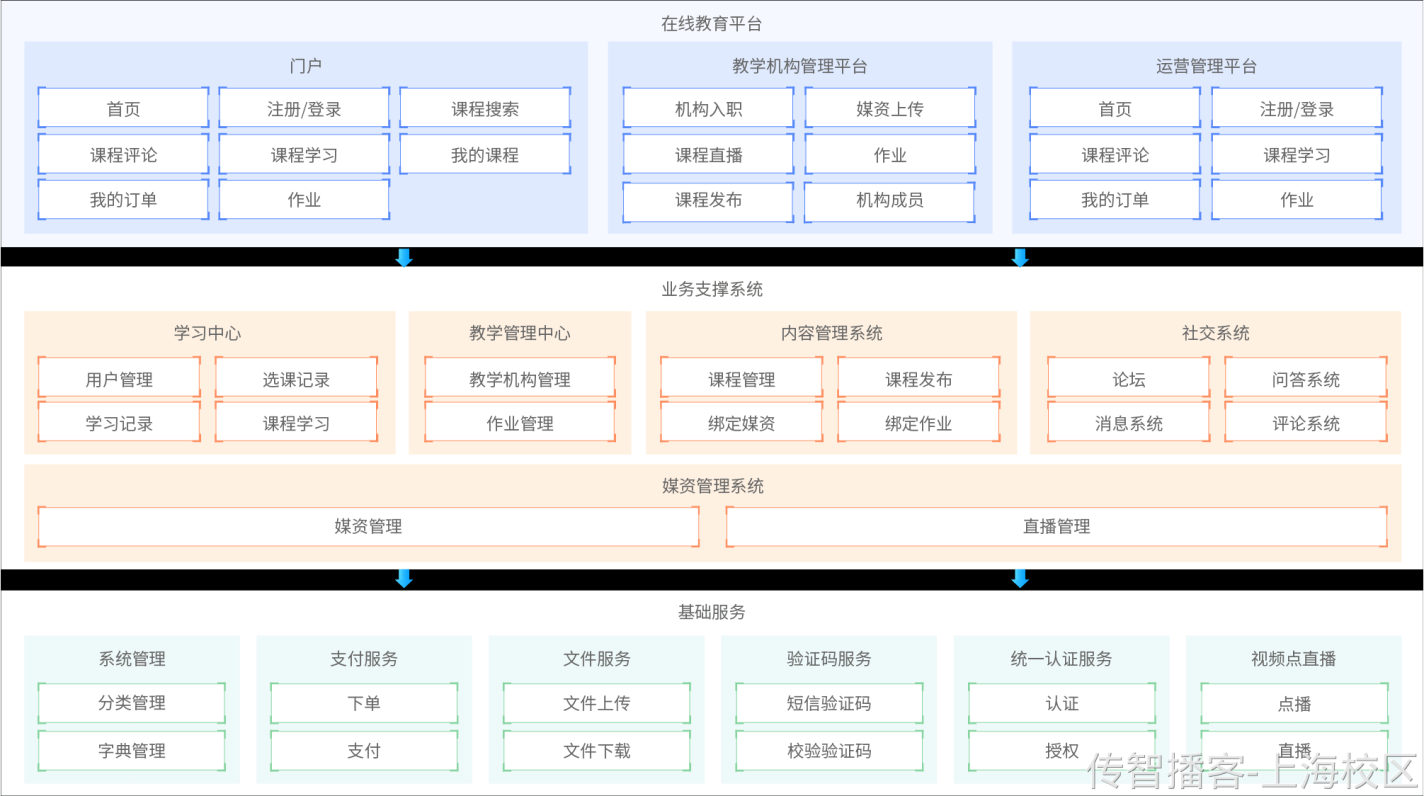 从在线教育的火热到如今,在线教育的模式出现多种多样,包括:B2C、C2C、B2B2C等业务模式。**学成在线采用B2B2C业务模式**,即向企业或个人在线教育平台提供教学服务,老师和学生通过平台完成整个教学和学习的过程,市场上类似的平台有:网易云课堂、腾讯课堂等,学成在线的特点是IT职业课程在线教学。<br /> **学成在线包括在线教育平台、业务支持系统、基础服务来构建整个功能架构**。<br />学成在线功能架构图