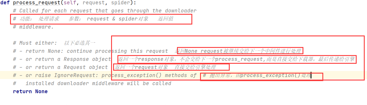 def process_request(self, request, spider):# Called for each request that goes through the downloader# 功能: 处理请求 参数: request & spider对象 返回值# middleware.# Must either: 以下必选其一# - return None: continue processing this request 返回None request被继续交给下一个中间件进行处理# - or return a Response object 返回一个response对象,不会交给下一个process_request,而是直接交给下载器,最后传递给引擎# - or return a Request object 返回一个request对象 直接交给引擎处理# - or raise IgnoreRequest: process_exception() methods of # 抛出异常,由process_exception()处理# installed downloader middleware will be calledreturn None