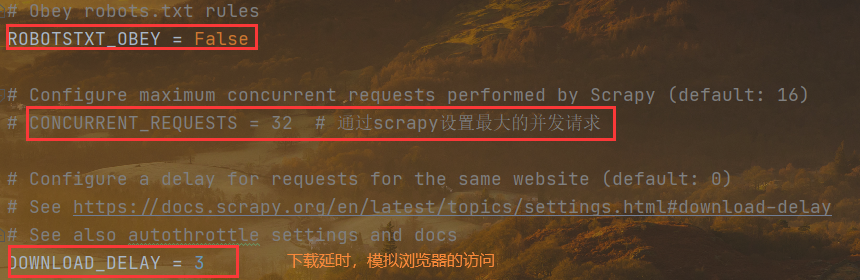# Obey robots.txt rulesROBOTSTXT_OBEY = False# Configure maximum concurrent requests performed by Scrapy (default: 16)CONCURRENT_REQUESTS = 32 # 通过scrapy设置最大的并发请求# Configure a delay for requests for the same website (default: 0)# See https://docs.scrapy.org/en/latest/topics/settings.html#download-delay# See also autothrottle settings and docsDOWNLOAD_DELAY = 3