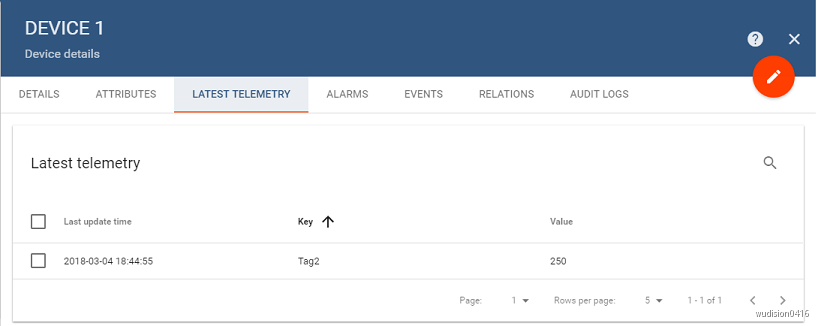 现在,您可以打开 ThingsBoard 网页界面,并在 设备 页面上观察新的设备 Device 1。您可以单击设备卡,并在相应的选项卡中观察传递的属性和遥测。