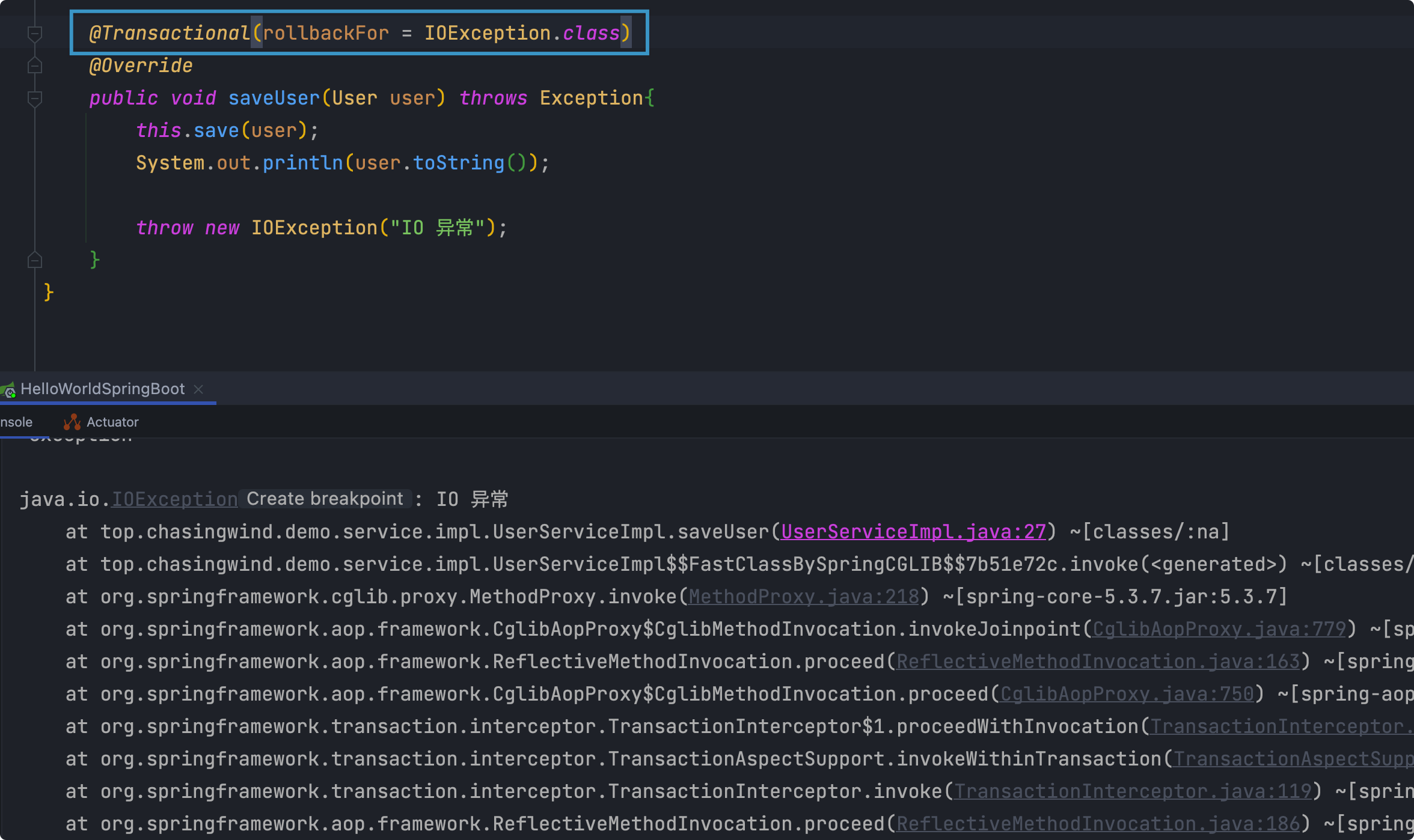 Debug演示(以异常回滚为例)