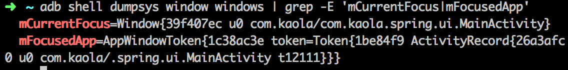 adb shell dumpsys window windows | grep -E 'mCurrentFocus|mFocusedApp'