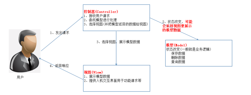 Web MVC中的M(模型)-V(视图)-C(控制器)概念和标准MVC概念⼀样,我们再看⼀下Web MVC标准架构, 如下图所示: