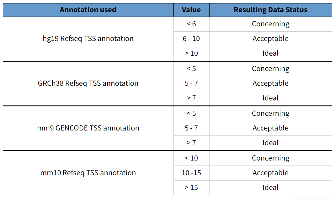 转录起始位点的标准化分数。阈值选择根据基因组而定。人类一般选择TSS分数大于5或者6的细胞样本[3]。如果分数太低说明细胞染色质结构瓦解,或者实验过程细胞裂解方式不当。