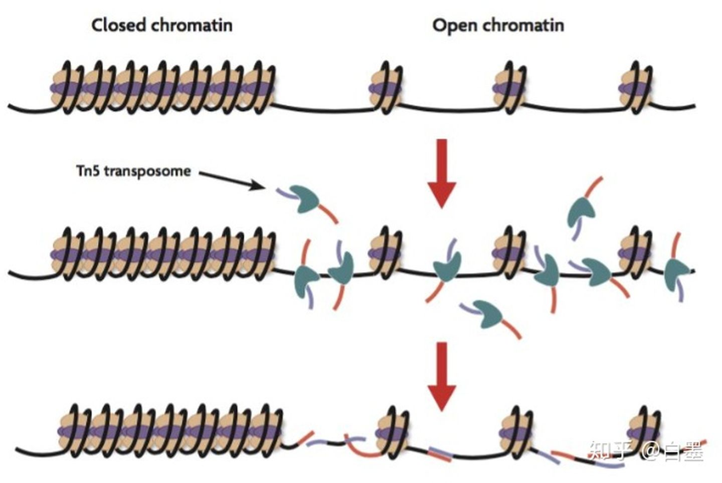 转座酶会携带特定的已知序列,然后将这些序列插入到开放的染色质区域中,最后将带有转座酶标记过的序列上机测序,通过软件计算,就能获得基因组哪些地方是开放的。