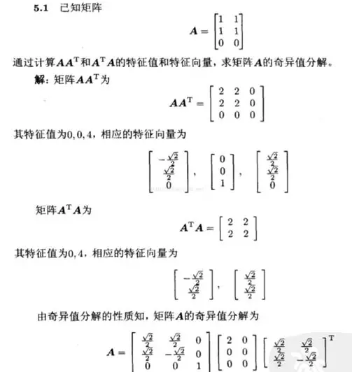 如此,根据之前提到的特征分解的方法,我们可以得到ATA n阶方阵的特征向量,这些特征向量就构成了奇异值分解中的V。同理,AAT m阶方阵的特征向量构成了奇异值分解中的U。