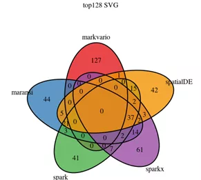 选取4种方法获得的前5000个SVG做韦恩图,可以看出所有方法共享约一半的SVG;Seurat的markvario,SpatialDE和SPARK共享3633个SVG;值得注意的是SPARKX鉴定到的1198个SVG,在其他方法中没有鉴定到。用另一个只含251个Spots的数据,得到的SVG更少。SPARK、SPARKX和SpatialDE共享37/128的SVG;SPARK、SpatialDE和Moran’s I共享21/128的SVG。