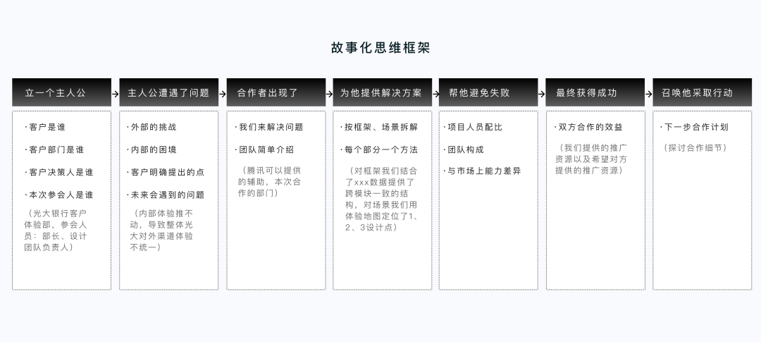 例如我们在和几个客户的提案中,从开始即定位成客户为本次的故事的主人公(1),在PPT的第2页就直接亮出问题(2),随即就讲在解决这个问题中,腾讯能带来什么,扮演的角色是什么(3),接下来就是方案(4),方案讲解完毕后,另起了一趴去讲在过程中可能会遇到的风险以及我们如何规避(5),在结束前,将最终合作后所带来的效益与客户同步(6),最后,引导客户采取下一步行动(7)。最终的效果都很不错,成功地拿到了合作。